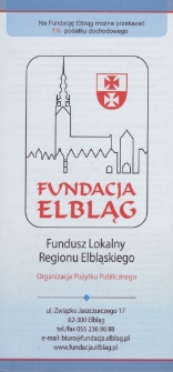 Z roku 2007 (prawdopodobnie, gdyż podana jest lista filantropów roku, ostatni wpis z 2006) roku) pochodzi składany na trzy druk reklamowy, będący formą prośby o datek na rzecz Fundacji Elbląg funduszu lokalnego regionu elbląskiego. Ta organizacja pożytku publicznego miała i ma swoją siedzibę przy ulicy Związku Jaszczurczego 17. Fundacja powstała jak wynika z dokumentu jako niezależna organizacja charytatywna, której celem jest wszechstronny rozwój Elbląga. Misją organizacji jest działanie na rzecz rozwoju społeczeństwa obywatelskiego, dumnego z Elbląga i regionu elbląskiego, wrażliwego na potrzeby innych, czerpiącego siły i aktywność z historii i tradycji. Fundacja działa wielotorowo, więc jest prośba o wpłacanie 1 % swojego podatku na jej konto. Oprócz składek fundacja bazuje na realizacji wszelkiego rodzaju programów jak również funduszy składkowych. Fundację wspiera zawsze Honorowy Obywatel Miasta Ryszard Rynkowski. Stronę tytułową otwiera charakterystyczny emblemat fundacji zbliżony kształtem do hieroglifa egipskiego wewnątrz, którego znajduje panorama kościoła Św. Mikołaja, Bramy Targowej i Starówki Elbląskiej. Nad nią Herb Starego Miasta Elbląga a pod panoramą charakterystyczny napis Fundacja Elbląg.