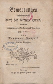 Niemieckojęzyczny przekład anglojęzycznej publikacji wydany w 1775 roku w Lipsku będący opisem osobistych doświadczeń oraz osobliwości z podróży po krajach Europy Północnej, w tym części państw dziś definiowanych jako kraje Europy Wschodniej zaś w czasach wczesnonowożytnych często określanych mianem „państw Północy”. Autorem opracowania jest Nathaniel William Wraxall (1751-1831) - brytyjski dyplomata i agent handlowy, agent kolejno Kompanii Wschodnioindyjskiej (ang. East India Company), a następnie rządu brytyjskiego. Niniejsza publikacja opracowana w formie dziewiętnastu listów jest relacją (dziennikiem) z podróży odbytej w okresie kwiecień – wrzesień 1774 roku po terenach dzisiejszej Danii, Szwecji, Finlandii, Łotwy, Estonii, Rosji i Polski. Materiał opatrzony osobistymi refleksjami autora co do oryginalności i specyfiki odwiedzanych miejsc, pełen jest informacji historycznych, przyrodniczych, gospodarczych i ekonomicznych. Szczególnie dużo miejsca zajmują listy z Kopenhagi, gdzie zauważalna jest antypatia autora do Duńczyków oraz Sztokholmu i Sankt Petersburga. Materiał zawiera również datowany 22 sierpnia 1774 roku list z Elbląga, w którym Wraxall zapoznaje nas z historią miasta liczącego w tamtym okresie około 15.000 mieszkańców, zwraca uwagę na specyfikę osobliwej zabudowy miejskiej oraz wyjątkowe znaleziska archeologiczne (m.in. srebrne zastawy i ozdoby), odkryte w piwnicach ratusza miejskiego.
