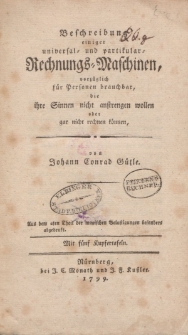 Tytuł: Beschreibung einiger universal - und partikular Rechnungs - Maschinen, vorzüglich für Personen brauchbar, die ihre Sinnen nicht anstrengen wollen oder gar nicht rechnen können