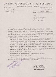 Biblioteka to nie tylko zbiór książek, jak większość z nas myśli ale także zbiór dokumentów świadczących o historii tej instytucji. Gromadzone przez biblioteki Dokumenty Życia Społecznego stanowią, źródła historyczne do przyczynków badań nad społecznościami lokalnymi i ich wewnętrznej strukturze oraz dokonującym się w nich zmianom. Rozporządzenie Rady Ministrów z 13 lipca 1993 roku w sprawie określenia zadań i kompetencji z zakresu rządowej administracji ogólnej i specjalnej, które mogą być przekazane gminom o statusie miasta wraz z mieniem służącym do ich wykonania, a także zasad i trybu przekazania, miała stać się przysłowiowym „gwoździem do trumny” Wojewódzkich Bibliotek Publicznych (WBP) w całym kraju, w tym także w Elblągu. Wymusiło na władzach biblioteki oraz Stowarzyszeniu Bibliotekarzy Polskich (SBP) Zarząd Okręgu w Elblągu nietypowe działania ratunkowe – listu do Sejmu Rzeczypospolitej Polskiej. W naszych zbiorach znajdujemy dwie wersje tej korespondencji – wysłaną i niezrealizowaną. Ale za nim do tego doszło, biblioteka otrzymała dwa pisma naglące w tej sprawie – do Dyrektorów WBP w całym kraju z Urzędu Rady Ministrów oraz ten którego miniaturkę widzicie obok. Pismo Urzędu Wojewódzkiego w Elblągu z Wydziału Kultury, Sportu i Turystyki dotyczące dwóch spraw – po pierwsze, określenia podstawowych zadań na przyszły 1994 rok (imprez oraz ich kosztorysu). Ważne było ustalenie kosztorysu ponieważ WBP traciła sponsora państwowego w postaci Wojewody Elbląskiego i przechodziła na koszt władz samorządowych w postaci Prezydenta Miasta Elbląga. Termin wykonania tego kosztorysu mijał 11 października 1993 roku. Druga sprawą, jeszcze bardziej bolesną było wyznaczenie terminu 15 grudnia 1993 roku na zakończenie obowiązkowej inwentaryzacji jednostki, która miała stać się podmiotem samorządu lokalnego.