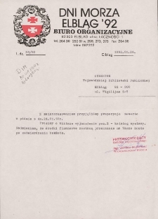 Title: Dni Morza Elbląg ’92 Biuro Organizacyjne – pismo