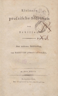 Kleinere prosaische Schriften von Schiller (Lipsk, 1792) - pierwsza część zbioru prac i pism wchodzących w skład bogatego dorobku literackiego Johanna Christopha Friedricha von Schillera (1759-1805), publikowanych w całości lub we fragmentach na łamach czasopism Thalia, Merkur etc. Schiller był niemieckim poetą, filozofem, historykiem, estetykiem, teoretykiem teatru i dramaturgiem. Już w wieku trzynastu lat próbował pisać wiersze i dramaty. W 1773 roku wstąpił do Karlsschule Stuttgart, elitarnej akademii wojskowej założonej przez księcia Wirtembergii Karola Eugeniusza, gdzie podjął studia medyczne i prawnicze. W szkole napisał w wieku osiemnastu lat swoją pierwszą sztukę Zbójcy (niem. Die Räuber), która przyniosła mu sławę (określano go mianem „niemieckiego Szekspira”). Po pierwszym wykonaniu Zbójców w Mannheim, w 1781 roku, został aresztowany, zabroniono mu też publikowania jakichkolwiek dalszych prac. Wyjechał wtedy ze Stuttgartu i przez Lipsk oraz Drezno dotarł w 1787 roku do Weimaru. W 1786 roku napisał poemat Oda do radości, będącą obecnie hymnem Unii Europejskiej. W 1789 roku został wykładowcą historii i filozofii w Jenie, gdzie pisał wyłącznie prace historyczne. W 1799 roku powrócił do Weimaru, gdzie Goethe przekonał go do powrotu do pisania sztuk. Razem z Goethem założył Weimar Theater, który stał się czołowym teatrem w Niemczech, przyczyniając się do odrodzenia dramatu. W Weimarze pozostał aż do śmierci. Zmarł na gruźlicę w wieku zaledwie 45 lat. W niniejszym zbiorze znajdują się prace o różnorodnej treści, formie i tematyce. Są to m.in.: Die Sendung Moses - esej, opisujący powstanie judaizmu w kontekście koncepcji Boga; praca historyczna - Über Völkerwanderung, Kreuzzüge und Mittelalter; reportaż kryminalny Der Verbrecher aus verlorener Ehre; akademicka mowa inauguracyjna o historii powszechnej, wygłoszona przez Schillera, z okazji rozpoczęcia jego wykładów na Uniwersytecie w Jenie; pisma filozoficzne publikowane na łamach czasopisma Thalia etc.