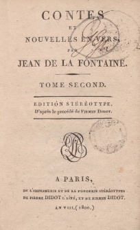 Contes et nouvelles en vers par Jean de La Fontaine (Paryż, 1800) - drugi tom zbioru frywolnych powiastek i opowiadań, których autorem jest francuski poeta i bajkopisarz, jeden z czołowych przedstawicieli klasycyzmu francuskiego, od 1684 roku członek Akademii Francuskiej - Jean de La Fontaine (1621-1695). Wszechstronność talentu literackiego La Fontaine’a sprawiła że uprawiał rozmaite gatunki i formy literackie, łączył wiersz i prozę, wiersz regularny i nieregularny etc. Choć dla potomnych pozostał przede wszystkim autorem bajek to rozgłos i pierwsze sukcesy literackie odniósł dzięki niniejszym „Contes…”, które zostały opublikowane po raz pierwszy w trzech częściach, w okresie 1665 - 1671. Inspirację dla zbioru opowiadań stanowiły francuskie i włoskie dzieła, w tym m.in. utwory takich twórców jak Giovanni Boccaccio (1313-1375) czy Ludovico Giovaniii Ariosto (1474-1533) oraz starofrancuskie fabliaux. Powiastki la Fontaine’a określane były jako wyuzdane, rozwiązłe, bezczelne, złośliwe, erotyczne, sprośne a nawet zadziorne. Nawiązywał w nich do starej tradycji literackiej, ale robił to na swój sposób, przekształcając szorstkie historie w bardziej wyrafinowane dzieła. Dbał o to, by obierać drogi, wysuwać sugestie i ukrywać swoje słowa, aby uczynić je bardziej zabawnymi.