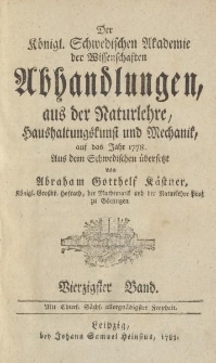 Der Königl. Schwedischen Akademie der Wissenschaften Abhandlungen… (Lipsk; 1783) - czterdziesty tom niemieckojęzycznego przekładu bogatego i zróżnicowanego zbioru publikacji Królewskiej Szwedzkiej Akademii Nauk, w opracowaniu niemieckiego naukowca, matematyka i epigramatyka Abrahama Gotthelfa Kästnera (1719-1800). Kästner, od 1731 roku studiował m.in. prawo, filozofię, fizykę, matematykę i metafizykę na Uniwersytecie w Lipsku. W 1739 roku, po uzyskaniu habilitacji został wykładowcą, a w 1746 profesorem. W 1756 roku został mianowany profesorem filozofii naturalnej i geometrii na Uniwersytecie w Getyndze, od 1763 był również dyrektorem obserwatorium astronomicznego. Za życia znany był zarówno jako matematyk, jak również jako poeta (tworzył epigramaty, odznaczające się ciętym humorem i dotyczące współczesnych autorowi osobistości) i filozof. Kästner, nie był może matematykiem twórczym, który wzbogacił matematykę o specjalistyczne pojęcia naukowe, jak np. Leonhard Euler (1707-1783), ale uznanie zyskał niewątpliwie przede wszystkim jako skuteczny autor podręczników, za pośrednictwem których wywarł duży wpływ na nauczanie matematyki. Kästner był członkiem Królewskiej Szwedzkiej Akademii Nauk i tłumaczył jej publikacje na język niemiecki. Akademia została założona 2 czerwca 1739 roku w Sztokholmie przez króla Fryderyka I Heskiego na wzór francuskiej Akademii Nauk. Stała się przede wszystkim korporacją elity naukowej, ciałem opiniodawczym, popularyzującym i oceniającym osiągnięcia w dziedzinie szeroko pojętych nauk matematyczno-przyrodniczych, medycznych, technicznych etc. oraz propagatorem wymiany myśli i doświadczeń między różnymi dyscyplinami. Niniejszy, czterdziesty tom publikacji zawiera 49 wyodrębnionych prac z roku 1778, które zostały opracowane przez różnych autorów. Należą do nich traktaty, informacje i teksty związane z aktualnymi, prowadzonymi wówczas badaniami, eksperymentami, odkryciami i pracami naukowymi z różnych dziedzin nauki (m.in. botanika, zoologia, medycyna, technika, mechanika, budownictwo, mineralogia). Czterdziesty tom porusza m.in. zagadnienia: klimatu w Szwecji; charakterystyki nowych i osobliwych gatunków roślin, owadów i zwierząt ( np. nosorożec z dwoma rogami - ryc.IX - str.293-294); opisów przypadków medycznych (np. osobliwy guz na czole u czteroletniego dziecka - ryc. V- str.175-176, przepuklina brzuszna, ugryzienie przez węża); opisów urządzeń i wynalazków (np. pług); właściwości arszeniku; obserwacji zaćmienia Słońca; wód leczniczych; nawożenia pól; doświadczeń chemicznych; charakterystyki drzewa orzechowego; obserwacji astronomicznych etc.