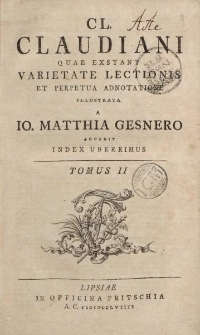 Tytuł: Cl. Claudiani quae exstant varietate lectionis et perpetua adnotatione illustrata a io. Mathhia Gesnero accedit index uberrimus. Tomus II
