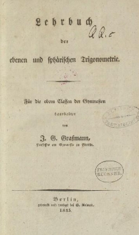 Lehrbuch der ebenen und sphärischen Trygonometrie (Berlin, 1835) - XIX-wieczny podręcznik trygonometrii płaskiej i sferycznej, zredagowany dla wyższych klas szkół średnich przez niemieckiego matematyka i nauczyciela gimnazjalnego Justusa Günthera Graßmanna (1779-1852). Zakres materiału niniejszego podręcznika został skupiony w części pierwszej wokół trygonometrii płaskiej i rozwiązywania trójkątów płaskich, natomiast w części drugiej na trygonometrii sferycznej, która zajmuje się badaniem własności funkcji trygonometrycznych i zastosowaniem w geometrii. Powstała ona znacznie wcześniej niż płaska, znajdując zastosowanie w astronomii Trygonometria sferyczna zajmuje się właściwościami trójkątów na powierzchni kuli. Trygonometria to słowo wywodzące się od greckich słów trigōnon „trójkąt” oraz metréō „mierzę”. Jest to dział matematyki poświęcony badaniu własności funkcji trygonometrycznych oraz ich wykorzystaniu w geometrii. Jej początki sięgają starożytności i wiążą się m.in. z wyznaczaniem tras w żegludze morskiej i określaniem położenia ciał niebieskich. Oczywiście ówcześni matematycy nie stosowali trygonometrii w dzisiejszej postaci. Opierali się na zależnościach pomiędzy bokami trójkąta równobocznego, kwadratu, pięciokąta i dziesięciokąta foremnego a promieniem opisanego na nich okręgu. Pierwsze tablice trygonometryczne (wtedy jeszcze bardzo proste) ułożył Hipparch około 180 roku p.n.e. W 150 roku n.e. Klaudiusz Ptolemeusz zamieścił w swej pracy tablice sinusów kątów od 1 do 90 stopni. Od V do XII wieku trygonometrią zajmowali się także Hindusi. Ich dzieła były tłumaczone z sanskrytu na język arabski, następnie z arabskiego na łacinę. Wskutek pomyłki jednego z tłumaczy powstała nazwa „sinus” (łac. „zatoka, zagięcie”). W XIX wieku na lekcjach matematyki funkcje trygonometryczne były używane przede wszystkim do rozwiązywania trójkątów płaskich (znajdujących się na płaszczyźnie) i sferycznych (umieszczonych na powierzchni kuli). Rozwiązywaniem trójkąta nazywano wówczas procedurę znajdowania długości wszystkich boków i miar wszystkich kątów trójkąta w oparciu o pewne dane wyjściowe. Trójkąty płaskie rozwiązywano na lekcjach matematyki we wszystkich dziewiętnastowiecznych szkołach średnich. W gimnazjach i szkołach typu realnego zadania te były na najwyższym poziomie trudności. Rozwiązywanie trójkątów sferycznych było zarezerwowane niemalże wyłącznie dla szkół przygotowujących młodzież do studiów uniwersyteckich. Autor niniejszego podręcznika wraz z rodzeństwem do 14 roku życia był nauczany przez prywatnych nauczycieli. Następnie uczęszczał do Marienstiftsgymnasium w Szczecinie. Od 1799 roku studiował teologię na Uniwersytecie w Halle. Od 1801 r. pracował jako prywatny nauczyciel rodziny właścicieli ziemskich Rattów w Retzowsfelde, a w 1802 r. został wicedyrektorem szkoły miejskiej i gminnej w Pyritz. W 1806 został podrektorem Vereinigten Königlichen und Stadtgymnasium w Szczecinie , z którym związany był aż do śmierci. W 1813 walczył jako ochotnik w wojnach wyzwoleńczych. Graßmann opublikował kilka artykułów z dziedziny matematyki i wniósł fundamentalny wkład w krystalografię. Był także członkiem szczecińskiej loży masońskiej „Zu den drei goldenen Zirkeln”, której jako Mistrz przewodniczył.