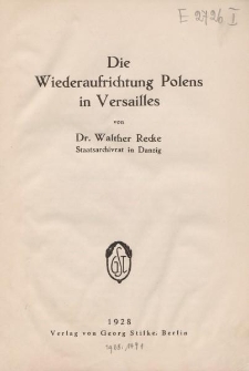 Die Wiederaufrichtung Polens in Versailles (Berlin, 1928) - publikacja poruszająca tematykę przywrócenia Rzeczypospolitej na mapy Europy, wskutek postanowień kończącego I wojnę światową traktatu wersalskiego, który m.in. ustalił wiele granic międzypaństwowych w Europie oraz wprowadził nowy ład polityczny. Wersalski traktat pokojowy sankcjonował odrodzenie Polski, kreśląc zarys jej zachodnich, północnych i południowych granic. Traktat ostatecznie przywracał Polsce niepodległość. Jednak odzyskanie zagarniętych niegdyś przez zaborców ziem nie było wcale łatwe. W Wersalu toczyły się wielodniowe dyskusje między innymi na temat przywrócenia Polsce dostępu do morza, czy też włączenia Śląska w granice Rzeczypospolitej. Ostatecznie utworzono Wolne Miasto Gdańsk, pod nadzorem Ligii Narodów, z własnym rządem, konstytucją i polityką gospodarczą. Włączono je jednak do polskiego obszaru celnego, Polska mogła korzystać z portu gdańskiego. O przynależności państwowej Górnego Śląska, Warmii i Mazur miały zadecydować przeprowadzone tam plebiscyty. Autorem opracowania jest niemiecki archiwista i historyk Walther Recke (1887-1962), którego zainteresowania badawcze skupiały się w głównej mierze na historii niemieckich ziem wschodnich i Europy Wschodniej. Politycznie i publicystycznie Recke, opowiadał się za rewizją granic określonych w traktacie wersalskim oraz przyłączeniem Wolnego Miasta Gdańska i Pomorza Nadwiślańskiego do Rzeszy Niemieckiej. Silnie utożsamiał się z ideologią Ostforschung, która opierała się na założeniu o wyższości cywilizacyjnej Niemców nad Słowianami. Utożsamiała ona przy tym obywateli Niemiec z plemionami germańskimi - Germanami. Głosiła pangermanizm z zaznaczoną wiodącą rolą Niemiec, z jednoczesnym wrogim nastawieniem wobec Słowian, tzw. antyslawizmem. Wysuwała propagandowe hasło o tzw. „niemieckiej misji na Wschodzie”, polegającej na cywilizowaniu Słowian. Ostforschung kierowanie się imperialnymi interesami Niemiec uzasadniał tezą o cywilizacyjnej, kulturalnej i gospodarczej misji Niemców na wschodzie, jednocześnie deprecjonując kulturę i osiągnięcia narodów tam mieszkających. Czechów, Polaków przedstawiał jako część ludów germańskich, które w wyniku barbarzyńskich najazdów ze wschodu uległy slawicyzacji, kwestionował przy tym ich odrębność oraz zdolność do samostanowienia. Ostforschung głosił również hasła rewizjonistyczne - „powrotu ziem utraconych (na rzecz Polski oraz Czechosłowacji)” w wyniku traktatu wersalskiego z 28 czerwca 1919 roku, podpisanego po zakończeniu I wojny światowej, oraz konferencji jałtańskiej, podpisanej po zakończeniu II wojny światowej. Po zagarnięciu terenów Czech oraz Polski w pierwszym stadium II wojny światowej Ostforschung zajął się podbudową ideologiczną programów germanizacyjnych przeprowadzanych przez nazistów na ziemiach okupowanych przez III Rzeszę. Niniejsza publikacja wpisuje się w retorykę ideologii Ostforschung. Recke, opisując zagadnienie „odrodzenia Polski w Wersalu” już w pierwszy zdaniu opracowania wyraża pogląd, że rozwiązanie kwestii polskiej w Wersalu było możliwe tylko dzięki serii zbiegów okoliczności, które okazały się szczególnie korzystne dla Polaków. Jednocześnie negatywnie odniósł się zarówno do praw jak i możliwości narodu polskiego do samostanowienia i samodzielnego utrzymania państwa.