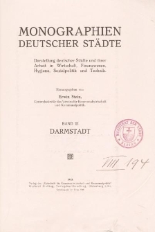 Wydana w 1913 roku w monografia położonego w kraju związkowym Hesja miasta Darmstadt , o którym poeta i pisarz zaliczany do niemieckiego ekspresjonizmu literackiego Kasimir Edschmid (1890-1966) pisał: „Darmstadt posiada swoje własne oblicze: pogodne, dystyngowane, niezbyt fantazyjne. W gruncie rzeczy konserwatywne, ale mimo to bezustannie odmładzane i inspirowane przez nowe trendy”. Ilustrowana bogatym materiałem fotograficznym i uzupełniona obszerną częścią reklamową publikacja jest pracą zbiorową pod redakcją Erwina Steina. Opracowanie wydano jako III tom wielotomowej serii monografii miast niemieckich. Materiał prezentuje m.in. : najważniejsze wydarzenia w dziejach miasta; opis zabytków, osobliwości oraz instytucji kultury; charakterystykę środowiska geograficznego oraz krajobrazu miasta i najbliższych okolic; zagadnienia rozwoju tkanki miejskiej, jej układu przestrzennego i urbanistycznego; analizę przebudowy przestrzennej i funkcjonalnej; zagadnienia opieki socjalnej; kwestie edukacji i nauki; charakterystykę przemysłu, handlu i rzemiosła; kwestie kształtowania funkcji społecznych i kulturowych miasta; opis życia kulturalnego; kwestie komunikacji i transportu etc.