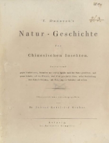 F.Donovan’s Natur-Geschichte der Chinesischen Insekten… ( Lipsk, [1801]) - niemieckojęzyczny przekład historii naturalnej chińskich owadów w opracowaniu brytyjsko-irlandzkiego zoologa i ilustratora Edwarda Donovana (1768-1837). Autor był zapalonym kolekcjonerem okazów historii naturalnej, nabywanych głównie na aukcjach okazów z wypraw eksploracyjnych (sam nie wyjeżdżał na zagraniczne wyprawy kolekcjonerskie). Był również autorem i ilustratorem książek o historii naturalnej, dotyczących owadów z Chin, Indii i Indonezji, a także rodzimych brytyjskich owadów, ryb, ptaków i mięczaków. W 1807 roku założył i prowadził w Londynie małe muzeum zoologiczno-botaniczne (London Museum and Institute of Natural History). Według katalogów i ówczesnych recenzji, obok jego brytyjskich kolekcji muzeum prezentowało kilkaset okazów ptaków, ssaków, gadów, ryb, mięczaków, owadów, koralowców i innych bezkręgowców z całego świata, a także okazy botaniczne. Publikacja Donovana uzupełniona unikatowymi kolorowymi rycinami zawiera opisy około stu nowych, wyjątkowych i pięknych gatunków chińskich owadów z zastosowaniem klasyfikacji szwedzkiego przyrodnika Karola Linneusza; szw. Carl von Linné (1707-1778) oraz w nawiązaniu do nazewnictwa duńskiego entomologa-myrmekologa, arachnologa i ekonomisty Johana Christiana Fabriciusa (1745-1808) i innych. Materiały i informacje do niniejszej publikacji Donovan pozyskał m.in. od brytyjskiego dyplomaty i wysłannika do Chin George'a Macartneya (1737-1806). Autorem niemieckojęzycznego przekładu i wydawcą jest niemiecki leksykograf i pisarz Johann Gottfried Gruber (1774-1851).