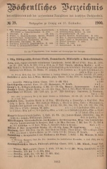 | 1900-09-27, Wöchentliches Verzeichnis der erschienenen und der vorbereiteten Neuigkeiten des deutschen Buchhandels. No.39 | Jun 10, 2024 |
