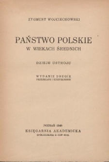 Państwo polskie w wiekach średnich. Dzieje ustroju (Poznań, 1948) - książka profesora Zygmunta Wojciechowskiego (1900-1955) - jednego z najbardziej znaczących polskich historyków XX wieku, prezentująca syntezę dziejów ustroju średniowiecznego państwa polskiego. Autor był absolwentem Uniwersytetu Jana Kazimierza we Lwowie, historykiem państwa i prawa, znawcą stosunków polsko-niemieckich i prekursorem myśli zachodniej. Dorobek przedwcześnie zmarłego uczonego jest imponujący. Młody Zygmunt Wojciechowski był znany już w latach trzydziestych nie tylko jako badacz, ale także jako związany z obozem narodowym działacz polityczny i pełen temperamentu publicysta, jeden z twórców myśli politycznej międzywojennego Dwudziestolecia. Później związał się z sanacją. Jako uczony zasłynął koncepcją macierzystych ziem Polski. Dał się też poznać jako uzdolniony organizator. Jego dziełem jest utworzony jeszcze w warunkach konspiracyjnych w grudniu 1944 r. Instytut Zachodni, (specjalistyczna placówka badawcza, zajmująca się szeroko pojętą problematyką niemiecką i dziejami trudnego sąsiedztwa polsko-niemieckiego), od kwietnia roku następnego działający już w Poznaniu. Był jego twórcą i pierwszym dyrektorem. Jego zainteresowania naukowe obejmowały głównie problematykę średniowiecznego ustroju państwa polskiego, historii gospodarczej i politycznej średniowiecznej Polski oraz średniowiecznej historii Śląska i Pomorza Zachodniego. Uważany jest za twórcę poznańskiej szkoły historii prawa i ustroju Polski. Z krótkiego wyjaśnienia autora dowiadujemy się, że książka napisana została w połowie jeszcze przed wybuchem wojny, 'w 1939 roku , w drugiej zaś połowie na przestrzeni drugiego półrocza 1940 roku. Natomiast wydana została po raz pierwszy w 1945 roku, tuż po zakończeniu II wojny światowej. W niniejszej pracy, kreśląc mechanizm i rozwój ustroju Polski średniowiecznej, Wojciechowski bierze pod uwagę zarówno położenie międzynarodowe naszego państwa i politykę zagraniczną naszych władców, jak również dzieje zmagań o władzę w obrębie społeczeństwa polskiego. Szeroko traktuje problem organizacji Kościoła w Polsce, stosunku państwa polskiego do Kościoła, zabiegów możnowładztwa o zapewnienie sobie wyodrębnionego stanowiska w społeczności szlacheckiej oraz wpływu na bieg spraw państwowych. Zwraca uwagę na oddziaływanie urządzeń społecznych i politycznych, które powstały na Zachodzie Europy i na różnice, jakie występują w rozwoju naszego ustroju państwowego w porównaniu z Zachodem. W skromnym zakresie zwraca natomiast uwagę na oddziaływanie' „momentów” ekonomicznych, mimo, że w przemianach społecznych i polityczno-ustrojowych odgrywały one niewątpliwie bardzo doniosłą rolę.