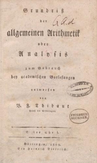 Grundriß der allgemeinen Arithmetik …(Getynga, 1809) - pierwsza część publikacji prezentującej zarys arytmetyki do wykorzystania na wykładach akademickich, w opracowaniu niemieckiego matematyka, profesora matematyki Uniwersytetu w Getyndze Bernharda Friedricha Thibauta (1775-1832). Autor studiował matematykę i fizykę pod kierunkiem Georga Christopha Lichtenberga, Johanna Beckmanna i Abrahama Gotthelfa Kästnera. W przeciwieństwie do wielu ówczesnych naukowców niemieckich nie podróżował naukowo. Doktorat obronił i karierę naukową prowadził na swoim macierzystym uniwersytecie. Przeszedł szczeble kariery akademickiej i w 1826 roku został wybrany rektorem. Jego podręczniki do matematyki były szeroko stosowane w ówczesnych Niemczech, a wykłady cieszyły się dużą popularnością. Był też bohaterem akademickich anegdot, jako osoba organizująca posiłki dla chorych studentów, ale też cierpiąca na depresję i pod koniec życia zamykająca się we własnym mieszkaniu. Pochodzące z początku XIX wieku opracowanie Thibaulta prezentuje zarys arytmetyki - jednego z podstawowych i najstarszych działów matematyki, zajmującego się liczbami. Wiedza o prehistorii arytmetyki jest ograniczona do kilku niewielkich artefaktów udowadniających posługiwanie się pojęciami dodawania i odejmowania przez ludy neolityczne. Najbardziej znanym jest kość z Ishango, datowana na epokę górnego paleolitu, która mogła służyć do zapisu systemu liczbowego. Prawdopodobnie Babilończycy posiadali szeroką wiedzę w niemal wszystkich aspektach elementarnej arytmetyki już dwa tysiące lat przed naszą erą. W papirusach ze starożytnego Egiptu pochodzących z XVII wieku p.n.e. można znaleźć dokładne algorytmy mnożenia i używania ułamków. Pitagorejczycy w szóstym wieku p.n.e. uznawali arytmetykę za jedną z czterech najważniejszych nauk. Znalazło to odbicie również w programie średniowiecznych uniwersytetów jako element Quadrivium, które razem z Trivium utworzyło siedem sztuk wyzwolonych.