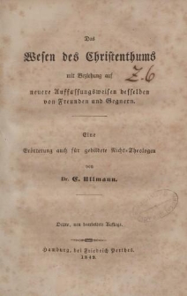 Das Wesen des Christenthums …(Hamburg, 1849) - publikacja z dziedziny teologii i filozofii religii, wydana po raz pierwszy w 1845 roku, w opracowaniu niemieckiego ewangelickiego teologa, autora licznych pism o treściach religijno - historycznych Carla Christiana Ullmana (1796-1865). Do jego najważniejszych dzieł należą Gregor von Nazianz (1825) , Die Reformatoren vor der Reformation (2 tomy, 1841) oraz Die Sündlosigkeit Jesu (1854). W niniejszej pracy autor odnosi się do istoty chrześcijaństwa inaczej mówiąc esencji chrystianizmu czyli więzi, relacji do osoby Jezusa Chrystusa, wcielonego Syna Bożego, a także do Boga Ojca i Ducha Świętego. Więź ta oparta jest na wierze w Boże Objawienie zawarte przede wszystkim w Biblii Starego i Nowego Testamentu, a także różnorako rozumianej Tradycji chrześcijańskiej. Ullmann odnosi się do nowych sposobów rozumienia istoty chrześcijaństwa zarówno ze strony jej zwolenników jak i przeciwników. Wyjaśnia, że jego zdaniem chrześcijaństwo jest niezależne od ortodoksyjnych zasad życia i że należy odróżniać wiarę od dogmatyzmu. Dokument współoprawny z innymi drukami (klocek introligatorski), sygn. KD.3597 - KD.3600.