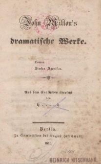 John Milton’s dramatische Werke (Berlin, 1840) - pochodzący z I połowy XIX wieku niemieckojęzyczny przekład dwóch dzieł („Comus” oraz „Samson Agonistes”) angielskiego poety i pisarza Johna Miltona (1608-1674). Pochodzący z zamożnej purytańskiej rodziny mieszczańskiej Milton urodził się w 1608 w Londynie. W 1629 roku ukończył studia na uniwersytecie w Cambridge, po czym poświęcił się studiom prywatnym. Okazał się nieprzeciętnym erudytą w zakresie klasycznych autorów antyku i chrześcijaństwa, opanował też łacinę, grekę, języki francuski, włoski oraz hebrajski. W pełni poświęcił talent sprawom religii i państwa. Przerósł epokę, w której żył, poprzez niełatwą tematykę swych utworów, nieczytelną dla osób bez klasycznego wykształcenia. Mistrzowskie operowanie językiem stawia go wśród największych autorów literatury światowej. Choć pisma Miltona zostały w większości docenione już za jego czasów, pełne ich zrozumienie nastąpiło dopiero w epoce oświecenia i później. Milton, a w szczególności jego „Raj utracony”(1667), stał się inspiracją dla wielu twórców, m.in. Williama Blake’a, Percy’ego Bysshe’ego Shelleya, Williama Wordswortha. (Operę Raj utracony stworzył w 1978 roku polski kompozytor Krzysztof Penderecki). „Comus” to sztuka dworska oparta na motywach sielankowych napisana przez Johna Miltona w 1634 r., wystawiona po raz pierwszy na zamku Ludlow w 1637 r. Spektakl jest maską, czyli rodzajem rozrywki popularnej w XVII wieku, łączącej muzykę, taniec i poezję. Opowiada historię młodej kobiety o imieniu Lady, która gubi się w lesie i zostaje zwabiona przez złego czarnoksiężnika Comusa, syna Bachusa i Circe, który za pomocą magii więzi ją w swoim pałacu i próbuje uwieść. Spektakl porusza tematy pokusy, cnoty, wstrzemięźliwości i czystości oraz władzy rozumu nad namiętnością. „Samson Agonistes” (pol. Samson walczący) to napisana w tradycji Sofoklesa tragedia, nazywana też poematem dramatycznym, opublikowana w 1671 roku. Grecki tytuł utworu znaczy dosłownie Samson atleta albo Samson zapaśnik. Dramat jest oparty na Biblii, a konkretnie na Księdze Sędziów i opowiada historię Samsona, największego izraelskiego mocarza, podstępnie pojmanego i oślepionego przez Filistynów. Bohater jest przedstawiony w ostatnich chwilach życia. Pokonuje rozpacz i jeszcze raz zbierając wszystkie siły obala kolumny podtrzymujące strop w świątyni Dagona, ginąc pod jej gruzami wraz ze swoimi prześladowcami.