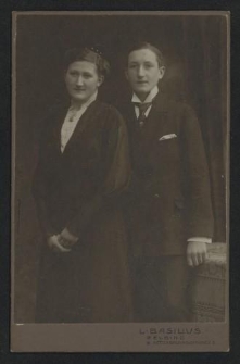 Fotografia studyjna pochodząca z elbląskiego atelier Lorenza Basiliusa (1860-1918). Na awersie portret kobiety i mężczyzny oraz nadruk z danymi fotografa (L. Basilius, Elbing, Kettenbrunnenstrasse 2-3). Na rewersie karta wizytowa atelier Basilisua. Datowanie fotografii: 1898-1918. Lorenz Basilius (1860-1918) to jeden z najwybitniejszych fotografików dawnego Elbląga. Wraz z żoną Johanną (1865-1965) prowadził największe atelier fotograficzne w Elblągu na przełomie XIX i XX wieku. Fotograf urodził się w 16 czerwca 1860 roku we Flensburgu. Chciał zostać inżynierem, ale z braku możliwości finansowych zdobył wykształcenie jako fotograf i z dużym powodzeniem uprawiał ten zawód. W 1888 roku w Berlinie poślubił retuszerkę Joannę z d. Schierloh. Po ślubie rodzina przeniosła się do Bydgoszczy, gdzie urodziła się im najstarsza córka Erna. W 1898 roku przenieśli się do Elbląga i kupili dom na Kettenbrunnenstrasse. 2/3 (dzisiejsza ul. Studzienna) i tam zamieszkali. Na poddaszu otworzyli atelier fotograficzne z przeszkloną altaną. W tylnych pomieszczeniach znajdowały się pracownie do wywoływania zdjęć i ich obróbki. Z wąskiego korytarza wchodziło się do właściwego pokoju urządzonego jak salon. Tam znajdowały się różnego rodzaju rekwizyty i klient mógł sobie wybrać któreś z nich, podobnie jak blejtram, na którego tle chciał być sfotografowany. Basilius specjalizował się w wykonywaniu powiększeń, zdjęć portretowych, grupowych i fotografii dzieci. Elbląskie atelier Basiliusa czynne było codziennie od 9.00 do 19.00. Od około 1898 roku zaczął wydawać widokówki Od 1900 roku sprzedawał także wszelkiego rodzaju artykuły fotograficzne. Od 1904 roku wykonywał powiększenia z każdego zdjęcia. W 1907 roku w książce "Die Stadt Elbing und ihre Umgebung" Karla Pudora zamieszczono 67 jego zdjęć z Elbląga i okolic. W 1912 roku zachwalał wykonywane w swoim salonie zdjęcia portretowe, obrazy, ujęcia architektoniczne i zdjęcia wykonane w domach swoich klientów. Przez wszystkie lata reklamował się regularnie w miejscowych gazetach, co najmniej 2 razy w miesiącu. Brał aktywny udział w życiu sportowym miasta. Od 1903 roku był członkiem Elbląskiego Towarzystwa Gimnastycznego. W 1918 roku w wieku 58 lat, krótko po śmierci swojego syna Hansa zmarł. Po śmierci męża Joanna Basilius sprzedała posiadłość i atelier fotograficzne i przeniosła się do córki Erny Horn, do Sopotu. W 1925 roku przeprowadziła się na wieś Born i tam zmarła w 1965 roku. Lokalizacja oryginału - w zbiorach prywatnych Artura Jaroszewskiego. Opis fizyczny: 1.K; wymiary: 10,7 x 16,7 cm.