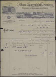 Sporządzony maszynowo oryginalny dokument księgowy (faktura) wystawiony przez Adam’s Cigarrenfabrik w dniu 30 maja 1913 roku, znajdujący się w zbiorach elbląskiego kolekcjonera. Na dokumencie ryciny przedstawiające główną siedzibę wytwórni w Bydgoszczy (niem. Bromberg) i filię fabryki w Elblągu (niem. Elbing). Fabryka Cygar „Adams” powstała w 1878 r. przy ul. Gdańskiej 54, w Bydgoszczy i zatrudniała ok. 20 pracowników. Jej pierwszym właścicielem był Julius Adam (1859–1919). Roczna produkcja wynosiła 1 milion cygar. Mimo dużego popytu właściciel nie mógł zwiększyć produkcji z powodu braku wykwalifikowanych robotników. W 1901 r., m.in. dzięki organizowanym w fabryce szkoleniom dla robotnic, liczba pracowników wzrosła do 50 osób. Nieco później współwłaścicielem fabryki został brat Juliusa - Isbert. W 1906 r. Adam’s Cigarrenfabrik uruchomił także filię w Elblągu z 60 pracownikami. W obu fabrykach w 1907 r. wyprodukowano 10 milionów cygar średniej i wysokiej jakości. Surowiec do produkcji sprowadzano z Ameryki Północnej i Południowej oraz z Indii Zachodnich. Używano tytoni: „Sumatra”, „Java”, „Brasilia”, „Havana”. Po śmierci brata i krótkim epizodzie współprowadzenia fabryki z wdową i synem po Juliusie (Martą i Zygfrydem Adam), Isbert Adam od 1922 r. zarządzał firmą samodzielnie. Otworzył filie w Grudziądzu (zatrudniającą 165 pracowników) i w Inowrocławiu (155 pracowników) oraz w Gdańsku. Według danych z 1923 roku bydgoski zakład i jego ekspozytury produkowały rocznie 25 milionów cygar.1 sierpnia 1924 r. firmę odsprzedano Skarbowi Państwa i przeszła ona pod zarząd Polskiego Monopolu Tytoniowego. Po gruntownej rozbudowie w drugiej połowie lat dwudziestych XX w. funkcjonowała do 1939 r. jako Państwowa Fabryka Wyrobów Tytoniowych. Lokalizacja oryginału - w zbiorach prywatnych Artura Jaroszewskiego. Opis fizyczny: 1.K; wymiary: 27,6 x 20 cm.