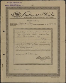 Oryginalny dokument potwierdzający zawarcie umowy ubezpieczenia odpowiedzialności cywilnej wystawionej przez niemiecką grupę ubezpieczeniową Stuttgarter Verein z jednym z ówczesnych elbląskich przedsiębiorców - za pośrednictwem agentury Adolfa Hermanna znajdującej się w Elblągu, przy ul. Królewieckiej (niem. Königsbergerstraße) 53. Nazwa ubezpieczającego mało czytelna. Reprezentantem ubezpieczającego był Obersteuersekretär Lange. Adres ubezpieczającego : Elbing, Roonstr. 1 (Elbląg, ul. Ratuszowa 1). Kilkustronicowa polisa zawierająca m.in. wniosek oraz ogólne warunki umowy ubezpieczenia została zawarta na okres 10 lat, od 18 października 1926 roku do 18 października 1936 roku. Stuttgarter Verein była niemiecką grupą ubezpieczeniową z siedzibą w Stuttgarcie. W 1927 roku doszło do największej fuzji w niemieckiej branży ubezpieczeniowej, która do 1940 roku funkcjonowała jako Allianz i Stuttgarter Verein. Poprzedniczka, Allgemeiner Deutscher Versicherungsverein w Stuttgarcie, założyła ubezpieczenie od odpowiedzialności cywilnej w Niemczech i jako pierwszy ubezpieczyciel w Niemczech wprowadziła na rynek polisy samochodowe. Europejski przełom w rozwoju ubezpieczeń odpowiedzialności cywilnej pojawił się za sprawą niemieckiej Haftpflichtgesetz z 1871 roku, kiedy to większość przedsiębiorców zaczęła masowo ubezpieczać swoich pracowników. W ten sposób narodziła się odpowiedzialność cywilna związana z wykonywaniem niektórych zawodów. Lokalizacja oryginału - w zbiorach prywatnych Artura Jaroszewskiego.