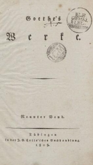 Goethe’s Werke …(Tybinga, 1808) - dziewiąty tom antologii utwór Johanna Wolfganga von Goethego (1749-1832) - najwybitniejszego niemieckiego poety okresu romantyzmu, dramaturga, prozaika, uczonego, polityka i wolnomularza. Obok Friedricha Schillera (1759-1805) był czołowym przedstawicielem klasycyzmu weimarskiego oraz prekursorem romantyzmu. Był również myślicielem i uczonym, znawcą wielu dziedzin wiedzy oraz sztuki. Dziewiąty tom antologii zawiera m.in.: pięcioaktową komedię, napisaną latem 1791 roku „Der Groß Cophta”, utwór z 1777 roku zatytułowany „Der Triumph der Empfindsamkeit”, komedię „Die Vögel”, jednoaktówkę z 1793 roku „Der Bürgergeneral” etc.