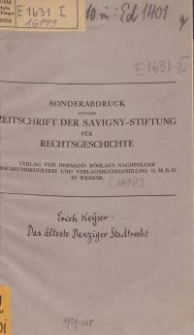 Artykuł Ericha Keysera na temat najstarszego gdańskiego prawa miejskiego. Keyser był historykiem, zajmującym się w głównej mierze dziejami Gdańska i ziem w delcie Wisły. Kierował również Krajowym Muzeum Historii Gdańska. Jego ambicją było przekształcenie placówki nie tylko w punkt gromadzenia pamiątek przeszłości, ale również ośrodek naukowy. W okresie Republiki Weimarskiej, a szczególnie Trzeciej Rzeszy był Keyser badaczem nacjonalistycznym. Nadbitka z „Zeitschrift der Savigny – Stiftung für Rechstgeschichte” (czasopisma wydawanego przez Fundację Savigny’ego. Powstała ona w 1861 r., w roku śmierci Friedricha Carla von Savigny – niemieckiego prawnika, założyciela historycznej szkoły prawa. Istniała ona do 1923, lecz czasopismo ukazuje się do dziś, będąc jednym z najstarszych niemieckich periodyków o tematyce prawniczej