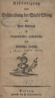 Zapowiedź wydania monografii M. G. Fuchsa "Beschreibung der Stadt Elbing und ihres Gebietes in topographischer, geschichtlicher und statisticher Hinsicht". Na stronie tytułowej druku odręczny podpis Fuchs’a. Druk pochodzi z książki współoprawnej (klocek) : W : Zum Andenken an das erste Preussische Musikfest. Na wstępie Autor wyjaśnił motywy powstania dzieła: powodowany ciekawością od wielu lat zajmował się ubocznie przeszłością Elbląga. Poznanie jego historii, ojczyzny w bliższym rozumieniu (Heimat), jest ważniejsze od dziejów ojczyzny w szerszym rozumieniu (Vaterland). Szczególna rola Elbląga w przeszłości dla jej mieszkańca jest szczególnym powodem do dumy, gdy do pewnego stopnia splendor jego przodków staje się także udziałem współczesnych. Dlatego też przeszłością Elbląga zajmowało się wielu jego poprzedników. Elbląscy mężowie stanu gromadzili też rękopiśmienne materiały o przeszłości potrzebne dla prowadzenia bieżącej polityki. Na tym polu szczególne zasługi położył Carl Ernst Ramsey. M. G. Fuchs zwraca uwagę, jak mało publikacji drukowanych ukazało się dotąd na temat Elbląga. Ponieważ artykuł Michaela Christopha Hanowa o Elblągu (1757) ukazał się bez wiedzy i aprobaty rady miejskiej, ta zwróciła się do władz Gdańska o zabronienie Hanowowi jego kontynuacji. Wskutek tej interwencji Hanow pracy nie dokończył. Fuchs wymienił jeszcze pracę Alexandra Nicolasa Tolkemita o nauczycielach elbląskich (rada miejska także usiłowała wstrzymać druk tej książki) i prace pozostające w rękopisie (Zahmela i Rupsona). Fuchs usprawiedliwia to postępowanie władz względami politycznymi: unikaniem zadrażnień z Kościołem katolickim i sąsiadami (Prusami). Przeszkody te zniknęły po 1772 r., ale wówczas chęć do napisania dziejów miasta osłabła. Jako motyw badania przeszłości Elbląga Fuchs wymienił chęć poznania jego ustroju, co mogłoby służyć lepszej obronie interesów miasta pod nowymi rządami. Wśród takich znawców Fuchs wymienił burmistrza Johanna Schmidta, Gottfrieda Gotscha, autora historii Nowego Miasta i swojego ojca, Samuela Gottlieba Fuchsa, który porządkował archiwalia miejskie po pożarze 1777 r. Ich kilkutomowe prace pozostały w rękopisie. Kolejni elblążanie, którzy wnieśli wkład do badań nad przeszłością miasta to Johann Heinrich Ammelung (kontynuator roczników Rupsona i Dewitza), Johann Jacob Convent (kolekcjoner archiwaliów, autor 10-ciotomowej kroniki miasta i opisu budynków publicznych) i Abraham Grübnau (wszechstronny badacz, autor wielu opracowań, które pozostały w rękopisie). W 1812 r. uzyskał Fuchs zgodę na badanie archiwaliów miejskich. Szczególnie podkreślił znaczenie recesów (protokołów z posiedzeń rady miejskiej). Recesy z lat 1700-1771 zachowały się w całości. Dla okresu rządów pruskich źródłem informacji byli budowniczowie miejscy. Fuchs zamierzał pierwotnie napisać kronikę miasta. Jednak ostatecznie zrezygnował z tego zamiaru, aby najpierw dać statystyczny i topograficzny opis miasta i jego terytorium w rozwoju historycznym. Następnie Fuchs przedstawił dokładny konspekt pracy I tomu pracy (ukazał się w 1818 r.). Wyjaśnił, że liczy na subskrybentów, co pozwoli sfinansować druk dzieła. Pozwoli to także przygotować następne dwa tomy. W zmienionej nieco formie ta zapowiedź wydawnicza ukazał się jako przedmowa do tomu I.