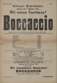 Afisz teatralny operetki w trzech aktach "Boccaccio" wystawionej 6 lutego 1885 roku w elbląskim Teatrze Miejskim.