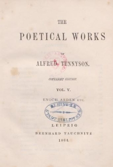 The Poetical Works of Alfred Tennyson (Lipsk, 1864) - piąty tom antologii dzieł poetyckich największego poety postromantyzmu wiktoriańskiego Sir Alfreda Tennysona (1809-1892). Literat urodził się w Somersby - wsi w hrabstwie Lincolnshire. Istotny wpływ na rozwój jego talentu pisarskiego miała sytuacja rodzinna. Jego ojciec był człowiekiem niezrównoważonym, nadużywającym alkoholu. Mimo trudności rodzinnych, a być może właśnie dlatego, że ich doświadczył, Alfred Tennyson już w młodości tworzył poezję. Istotny wpływ na jego twórczość miała także przyjaźń z Arthurem Hallama’em (1811-1833), którego poeta poznał w czasie studiów w Cambridge. Literackie upamiętnienie przyjaciela w jednym z utworów przyniosło mu uznanie krytyków i czytelników. Pierwsze utwory Alfreda Tennysona ukazały się drukiem we wspólnym zbiorze, wydanym przez niego wraz z bratem, gdy miał on zaledwie 17 lat, przyniosły autorowi rozgłos, ale jeszcze nie uznanie. Samodzielnie debiutował zbiorem „Poems Chiefly Lyrical” w 1830 r. Pomimo ogólnej krytyki za sentymentalizm, publikacja nie była całkowitą porażką. Tennyson musiał na pewien czas odłożyć swoje plany edukacyjne i twórczość poetycką. Przyczyną tej decyzji była śmierć jego ojca, która nastąpiła w 1831 r. Poeta zrezygnował wówczas ze studiów, by pomóc matce wychowywać własne rodzeństwo. W 1833 roku wydał kolejny zbiór wierszy, zawierający m. in. słynną „Panią z Shalott”. W tym samym roku zmarł jego najlepszy przyjaciel Hallam (narzeczony jego młodszej siostry Emilii). Żałoba po stracie przyjaciela i problemy finansowe spowodowane nietrafionymi inwestycjami sprawiły, że na pewien czas ponownie porzucił twórczość poetycką. Opublikowane po długiej przerwie wiersze, przyniosły radykalną zmianę w postrzeganiu tego poety przez współczesnych. W 1842 r. opublikował dwa tomy poezji. Właśnie dzięki utworom w nich zawartym zdobył uznanie krytyków. Po tych publikacjach i dzięki ich przychylnym recenzjom zdobył nie tylko rozgłos, ale i uznanie. W 1850 został "poetą laureatem". Była to godność nadwornego poety na brytyjskim dworze królewskim. Piastował tę funkcję aż do śmierci. W 1842 r. powstało także ważne dla samego poety dzieło: „In Memoriam A. H. H.”, będące elegią po śmierci zmarłego przyjaciela. Literacki hołd złożony przyjacielowi został także oceniony jako jeden z najlepszych utworów tego autora. Będąca admiratorką jego twórczości królowa Wiktoria nadała mu w 1884 roku – jako pierwszemu w historii poecie - tytuł szlachecki. Tom piąty zawiera wybrane wiersze i poematy, w tym m.in. poemat narracyjny „Enoch Arden” opowiadający o rybaku, później marynarzu, który trafia na bezludną wyspę i po 10 latach wraca do domu, wiersz „The Grandmother”, który jest poruszającą medytacją nad ludzkim doświadczeniem, stratą ukochanej osoby, żalem i trwałą mocą miłości, utwór „Sea Dreams” stanowiący liryczną i dramatyczną refleksję dotyczącą niefortunnej inwestycji poety na początku lat czterdziestych XIX wieku etc. Niniejszy egzemplarz został opublikowany jako 742 tom ukazującej się od 1842 roku serii Collection of British Authors, w lipskiej oficynie wydawniczej Bernharda Tauchnitza (1816-1895).