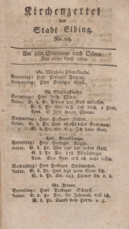 Seit dem 7. September 1778 gab Friedrich Traugott Hartmann weitere Elbinger Zeitschrift: Kirchenzettel der Stadt Elbing” heraus. Ursprünglich wurden in die Zeitung Anzeigen betreffs der Gottesdienstordnung in den Elbinger Kirchen gesetzt, im Laufe der Zeit kamen noch Predigten, Aufgebote, Texte der religiösen Lieder dazu. Die Zeitschrift erschien einmal in der Woche, zählte 4 Seiten und war unter den Einwohnern Elbings ziemlich populär. In den Jahren 1827-29 änderte der Titel in Kirchen=, Addreß= und Intelligenz= Zettel der Stadt Elbing ab. Die Zeitschrift hörte 1829 auf zu erscheinen. Elbinger Bibliothek besitzt in ihren Beständen 20 Jahrgänge aus den Jahren 1799-1828 (unvollständig).