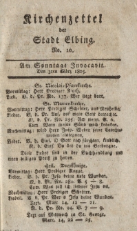 Seit dem 7. September 1778 gab Friedrich Traugott Hartmann weitere Elbinger Zeitschrift: Kirchenzettel der Stadt Elbing” heraus. Ursprünglich wurden in die Zeitung Anzeigen betreffs der Gottesdienstordnung in den Elbinger Kirchen gesetzt, im Laufe der Zeit kamen noch Predigten, Aufgebote, Texte der religiösen Lieder dazu. Die Zeitschrift erschien einmal in der Woche, zählte 4 Seiten und war unter den Einwohnern Elbings ziemlich populär. In den Jahren 1827-29 änderte der Titel in Kirchen=, Addreß= und Intelligenz= Zettel der Stadt Elbing ab. Die Zeitschrift hörte 1829 auf zu erscheinen. Elbinger Bibliothek besitzt in ihren Beständen 20 Jahrgänge aus den Jahren 1799-1828 (unvollständig).