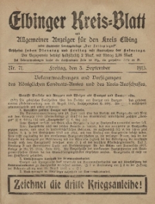 | 1915-09-03, Kreis-Blatt des Königlich Preußischen Landraths-Amtes zu Elbing, Nr. 71 Freitag 3 September 1915 | 3 sty 2019 |