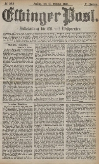 „Elbinger Post”. Gazeta ludowa dla prowincji Prusy. Ukazywała się codziennie z wyjątkiem poniedziałków i dni poświątecznych. Okoliczni czytelnicy mieli możliwość zamówienia prenumeraty. Dziennik czterostronicowy, gdzie na pierwszej stronie zamieszczano przegląd polityczny i wiadomości z kraju i ze świata. Wydawca starał się umieszczać artykuł wstępny, poniżej artykuły dotyczące np. wystaw światowych, historii cygar, introligatorstwa, poglądów na małżeństwo, wrażeń z podróży zagranicznych (artykuły dostarczane od korespondentów oraz osób prywatnych), zamieszczane były również wiersze . Na drugiej stronie informacje z Niemiec, wiadomości o obradach parlamentarnych oraz teść telegramów wysyłanych do redakcji o najświeższych wydarzeniach. Strona trzecia poświęcona była zagadnieniom z prowincji (Gdańsk, Toruń, Grudziądz, Pasłęk, Tczew). Ostatnią stronę zajmowały ogłoszenia i reklamy, spora część adresowana była do rolników i hodowców, znajdowały się ogłoszenia z zapowiedziami kulturalnymi (spektakle teatralne, występy gościnne), ogłoszenia drobne i anonse (inseraty). Do niektórych numerów ukazywały się dodatki (Beilage). Dziennik ukazywał się w układzie trzykolumnowym, wydawany w elbląskiej drukarni Neumann-Hartmann przez właścicieli m.in. Edwarda Schlömpa czy później Theodora Mohr’a (od nr 85 roku 1875). Dziennik posiada pieczątki własnościowe Heinricha Wiedwalda.