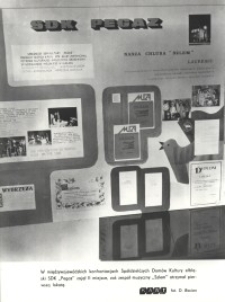 Autor zdjęcia : Dariusz Bocian, W : Miesięczna Kronika Fotograficzna : województwo elbląskie – sierpień – 1979 r. (Nr 8/79). Gdańsk, Wydaw. : Krajowa Agencja Wydawnicza. Redaktor wydania : W. Amerski. Format : 21 x 28 cm.Spółdzielczy Dom Kultury „Pegaz” powstał z ruin kościoła na który złożyły się wszystkie spółdzielnie pracy w Elblągu. Istniał w latach 1977 – 1980 i mieścił się w Kościele Bożego Ciała przy ul. Robotniczej 29 w Elblągu. Kościół został zbudowany w XV wieku, w miejscu drewnianej kaplicy, którą w 1400 r. zniszczył pożar, następnie został przebudowywany i rozbudowywany w XVII i XIX w. Klub „Pegaz” miał bardzo szeroką ofertę kulturalną, odbywały się tu cykliczne „Zaduszki jazzowe”, spotkania autorskie, wystawy, a w latach 1977-81 funkcjonowała tu grupa muzyczna „Szlem”. W grudniu 1981 r. ówczesny wojewoda elbląski wydał decyzję o zwróceniu kościoła Bożego Ciała władzom kościelnym i w ten sposób Spółdzielczy Dom Kultury „Pegaz” przestał istnieć.Na zdjęciu dyplomy i wyróżnienia upamiętniające nagrodzonych laureatów, m.in. zespół muzyczny „Szlem”.