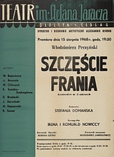 Premiera tej komedii w trzech aktach odbyła się 15 sierpnia 1968 roku. Reżyseria - Stefania Domańska; scenografia - Irena i Romuald Nowiccy. Włodzimierz Perzyński (1877 - 1930) - dramatopisarz, poeta, tłumacz, publicysta i krytyk filmowy. Współpracował z takimi czasopismami jak: "Głos Narodu" i "Tygodnik Ilustrowany". Prócz licznych utworów dramatycznych, wśród których największą sławą cieszyły się: "Lekkomyslna siostra","Aszantka" i "Szczęście Frania", był również twórcą powieści ("Złoty interes" 1915, "Uczniaki" 1919, "Raz w życiu" 1925, "Nie było nas - był las" 1926, "Klejnoty" 1930) i tomów nowel ("To co nie przemija" 1906, "Pamiętnik wisielca" 1907, "Cudowne dziecko" 1921, "Znamię" 1927). Piętnujący w swych dziełach drobnomieszczańskie zakłamanie, nietolerancję, ciasnotę horyzontów i zacofanie niejednokrotnie porównywany był do Gabrieli Zapolskiej. Dwa jego dzieła doczekały się adaptacji filmowej: w 1913 roku Kazimierz Kamiński przeniósł na ekran "Aszantkę", zaś 14 lat poźniej Ryszard Ordyński wyreżyserował "Uśmiech losu".