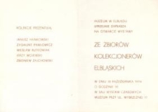 Muzeum w Elblągu zaprasza 16.10.1974 r. na wystawę prac ze zbiorów elbląskich kolekcjonerów: Janusza Hankowskiego, Zygmunta Pawłowicza, Wiesława Rutkowiaka, Jerzego Wojewskiego i Zbigniewa Zajchowskiego.