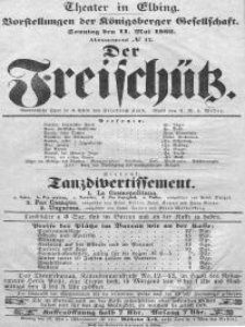Afisz teatralny opery romantycznej „Wolny strzelec”, muzyka Carla von Webera, wystawionej przez Królewieckie Towarzystwo Teatralne 11 maja 1862 roku.