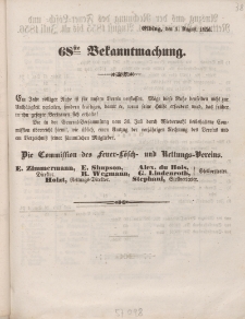 Sześćdziesiąte ósme obwieszczenie Komisji Stowarzyszenia Pożarniczego. Komunikat informuje o walnym zgromadzeniu, podczas którego miały miejsce wybory, w wyniku których utrzymano dotychczasowy skład Komisji. Miniony rok był spokojny, upłynął bez żadnej akcji ze strony Stowarzyszenia. Komisja wyraża w piśmie nadzieję, iż bezczynność ta nie odbije się skuteczności działania Stowarzyszenia, gdy pojawi się konieczność niesienia pomocy przy ewentualnym pożarze. Książka współoprawna, zawierająca druki dotyczące pożarnictwa (W : Statut des Elbinger Feuer=Lösch=und Rettung=Vereins (sygn. IV.9.1 Elbląg)