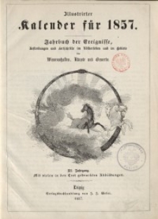 Ilustrowany kalendarz na rok 1857. Kalendarze różnego rodzaju, przeznaczone dla różnego grona odbiorców, stanowiły formę wydawniczą charakterystyczną dla niemieckiego rynku księgarskiego w XVIII i pierwszej połowie XIX w kiedy to uważano je za niezbędny element porządkujący życie prywatne, towarzyskie, zawodowe etc., przy czym właściwy kalendarz stanowił na ogół tylko niewielką część wydawnictwa, większość miejsca natomiast przeznaczono na różnego rodzaju dodatkowe informacje. „Illustrierter Kalender“ dostarczał niemieckiemu czytelnikowi wiadomości z dziedziny sztuki, rozwoju nauki i przemysłu, życia społecznego oraz polityki w wieku „pary i elektryczności“. Biblioteka Elbląska posiada w swoich zbiorach nr periodyku z 1857 r. Tom jest podzielony na części – obok właściwego kalendarza zawiera „kalendarz historyczny”, „wojskowy”, „rolniczy”, „przemysłowy”, „handlowy”, „prawniczy”, „kościelny i szkolny” „naukowy”, „artystyczny”, „dworski”, „domowy i kobiecy” etc. każdorazowo z informacjami z tych dziedzin. Układ treści dwukolumnowy, w tekście liczne ilustracje.