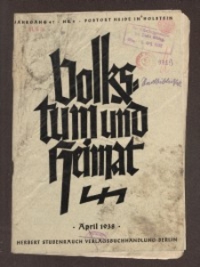 Czasopismo niemieckie wydawane w latach trzydziestych i czterdziestych. Zakres tematyczny czasopisma oscylował wokół dwóch pojęć, charakterystycznych dla polityki kulturalnej III rzeszy: „Volkstum” (ludowość) i „Heimat” (mała ojczyzna). W zakres pojęcia „Heimat” wchodziły takie kwestie jak zwyczaje, baśnie, dialekt, pieśń, taniec i inne aspekty sztuki ludowej. Czasopismo „Volsktum und Heimat” należało do wielu narzędzi służących tzw. „Volkstumsarbeit”, czyli pracy na rzecz podtrzymywania „ludowości” uosabiającej, jak chciała propaganda siłę niemieckiego ducha. Szczególne znaczenie przypisywano Volkstumsarbeit na terenach granicznych („Grenzland”) oraz obszarach z liczną mniejszością niemiecką, np. w Siedmiogrodzie. Czasopismo zawiera liczne reprodukcje wytworów sztuki ludowej i fotografie. Jednym z twórców nowej serii czasopisma "Volkstum und Heimat: Zeitschrift für nationalsozialistische Kulturarbeit", był nauczyciel, publicysta, pisarz ludowy - Heinrich Sohnrey (1859-1948). Na stronie tytułowej pieczęć nadburmistrza Elbląga. Biblioteka Elbląska w swoich zasobach posiada zeszyty z lat 1938-1941 (niekompletne).