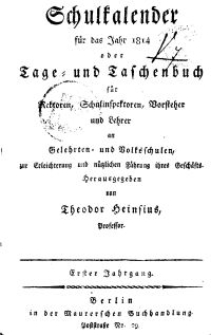 Kalendarz szkolny na rok 1814 oraz 1815, przeznaczony m.in. dla dyrektorów, inspektorów oraz nauczycieli. Redaktorem kalendarza był niemiecki pedagog, leksykograf, dyrektor berlińskiego gimnazjum - Theodor Heinsius (1770-1849). Kalendarz z 1814 r., w ciekawej marmurkowej oprawie kopertowej, z kieszonką, w której umieszczono plan lekcji dla klas gimnazjalnych. Oprócz wiadomości tematycznych, przydatnych dla nauczycieli, kalendarz zawiera puste karty (z podziałem na miesiące) – do prowadzenia indywidualnych zapisków.