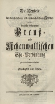 Tytuł: Die Vortheile beyde des verehelichten und unverehelichten Standes bey der beglückt vollzogenen Preuss=Achenwallischen Ehe=Verbindung