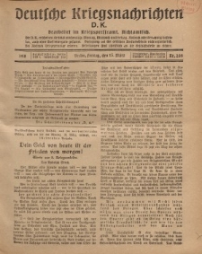 "Deutsche Kriegsnachrichten. D. K. Zusammengestellt im Kriegspresseamt. Nichtamtlich" - niemieckie aktualności wojenne, korespondencja i reportaże z działań I wojny światowej oraz ogólne wiadomości ze świata. Gazeta ukazywała się trzy razy w tygodniu: w poniedziałki, środy i piątki. Czasopismo wydawane na niskiej jakości papierze, ale mimo ograniczeń związanych z papierem, w drukarniach - większość stron drukowana nieoszczędnie (co druga karta pusta). Paginacja w obrębie poszczególnych numerów, natomiast numeracja zeszytów ciągła dla wszystkich roczników. W numerach poniedziałkowych ukazywał się dodatek "Deutsche Marine=Nachrichten...", w środy od września 1918 dodatek "Nachrichten der Luftstreitkräfte..." (oba dodatki z własną numeracją oraz paginacją). Biblioteka Elbląska w swoich zbiorach posiada roczniki z lat 1916-1918.