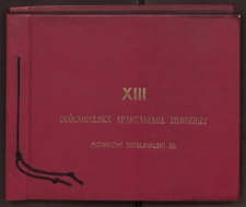Album z licznymi zdjęciami XIII-tej Ogólnopolskiej Spartakiady Młodzieży, która miała miejsce w 1986 roku w Piotrkowie Trybunalskim. Zawody juniorów młodszych i starszych organizowane od 1969 roku przez związki sportowe oraz organizacje sportowe, organizowane co 2 lata, od 1980 rokrocznie w 4 blokach dyscyplin sportowych: sporty zimowe, biegi przełajowe, sporty letnie i sporty halowe. Celem Ogólnopolskiej Spartakiady Młodzieży było propagowanie i upowszechnianie sportu. Miasto Piotrków Trybunalski gościło zawodników z wielu miast, organizując współzawodnictwo sportowców różnych dyscyplin, na różnych obiektach sportowych, w tym na stadionie XXXV- Lecia PRL. Stadion przebudowany na potrzeby organizacji Centralnych Dożynek w 1979 r. - był nowoczesnym kompleksem, mieszczącym 19 tys. widzów. Na zdjęciach uwieczniono moment zapalenia znicza, prezentację drużyn, pokazy przed zawodami, przemarsz zawodników, wciąganie flagi na maszt, trybuny z gośćmi, pokazy jeździeckie, skoki balonowe, skoki w dal i wzwyż, żeglarstwo, piłka nożna, kolarstwo, pływanie, jeździectwo, wręczanie medali oraz pucharów, wywiady z zawodnikami, fragmenty reklam sportowych na stadionie poświęcone propagowaniu sportu masowego i indywidualnego (np. "Poprzez sport i kulturę do socjalistycznego wychowania") etc. Zdjęcia pamiątkowe ze spartakiady przekazano w darze Bibliotece Elbląskiej.
