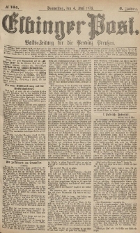 „Elbinger Post”. Gazeta ludowa dla prowincji Prusy. Ukazywała się codziennie z wyjątkiem poniedziałków i dni poświątecznych. Okoliczni czytelnicy mieli możliwość zamówienia prenumeraty. Dziennik czterostronicowy, gdzie na pierwszej stronie zamieszczano przegląd polityczny i wiadomości z kraju i ze świata. Wydawca starał się umieszczać artykuł wstępny, poniżej artykuły dotyczące np. wystaw światowych, historii cygar, introligatorstwa, poglądów na małżeństwo, wrażeń z podróży zagranicznych (artykuły dostarczane od korespondentów oraz osób prywatnych), zamieszczane były również wiersze . Na drugiej stronie informacje z Niemiec, wiadomości o obradach parlamentarnych oraz teść telegramów wysyłanych do redakcji o najświeższych wydarzeniach. Strona trzecia poświęcona była zagadnieniom z prowincji (Gdańsk, Toruń, Grudziądz, Pasłęk, Tczew). Ostatnią stronę zajmowały ogłoszenia i reklamy, spora część adresowana była do rolników i hodowców, znajdowały się ogłoszenia z zapowiedziami kulturalnymi (spektakle teatralne, występy gościnne), ogłoszenia drobne i anonse (inseraty). Do niektórych numerów ukazywały się dodatki (Beilage). Dziennik ukazywał się w układzie trzykolumnowym, wydawany w elbląskiej drukarni Neumann-Hartmann przez właścicieli m.in. Edwarda Schlömpa czy później Theodora Mohr’a (od nr 85 roku 1875). Dziennik posiada pieczątki własnościowe Heinricha Wiedwalda.