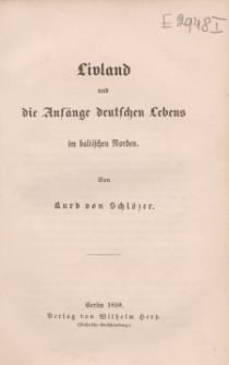 Publikacja wydana w Berlinie w 1850 roku autorstwa Kurda von Schlözer (1822-1894), niemieckiego dyplomaty i historyka przedstawiająca rys historyczny północnych obszarów regionu bałtyckiego w okresie od XI – XIII wieku i prezentująca tematykę chrystianizacji i germanizacji Inflant, historycznej krainy nad Dźwiną i Zatoką Ryską zamieszkanej przez plemiona bałtyckie (przodków obecnych Łotyszów) i ugrofińskie (przodków obecnych Estończyków), na których kulturę na przestrzeni wieków wpływała głównie kultura niemiecka. Dawne Inflanty obejmują terytoria dzisiejszej Estonii i Łotwy. Obszerne opracowanie sięga czasów chrystianizacji prowadzonej przez Karola I Wielkiego (742 lub 747-814) - króla Franków i Longobardów, świętego cesarza rzymskiego od 800 roku i odkrycia Inflant przez kupców niemieckich (bremeńskich) w 1158 roku , za którymi przybyło duchowieństwo niemieckie. Fakt ten zdecydował na długie wieki o losach kraju i regionu. Kiedy misja apostolska zakonnika holsztyńskiego, późniejszego biskupa Meinarda, nie doprowadziła do całkowitej chrystianizacji kraju, wyprawy krzyżowe rycerstwa niemieckiego dokonały nawrócenia pogan siłą (za biskupa Bartolda i jego następców). Proces chrystianizacji Inflant przybrał zdecydowane formy germanizacyjne za biskupa Alberta I Appeldern, który skutecznie ujarzmił Inflanty przy pomocy zorganizowanego przez siebie w 1202 roku zakonu niemieckiego kawalerów mieczowych, poddanych w 1237 roku władzy Krzyżaków. Liwom, Estom i Łotyszom zagroził los, jaki spotkał bezpośrednich poddanych Krzyżaków – Prusów, a mianowicie germanizacja. Odrębny, ostatni rozdział publikacji poświęcony został Gotlandii (wyspie na Bałtyku należącej do Szwecji), która w średniowieczu stanowiła centrum handlowe regionu. Jej największe miasto - Visby od XI do XIV wieku wchodziło w skład północnoniemieckiej Hanzy. Dokument współoprawny z innymi drukami (klocek introligatorski), sygn. 34797a -34797b.