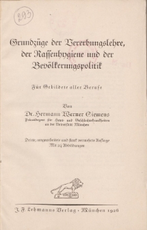Publikacja z dziedziny genetyki, wydana w 1926 roku w Monachium przestawiająca ogólny zarys i cechy charakterystyczne teorii dziedziczności oraz higieny ras ( niem. Rassenhygiene ) zwanej eugeniką i związaną z tymi zagadnieniami polityką demograficzną. Autorem materiału jest Hermann Werner Siemens (1891 -1969) - niemiecki lekarz, dermatolog, badacz bliźniąt, wykładowca akademicki na Uniwersytecie Monachijskim, od 1929 roku profesor dermatologii na Uniwersytecie Lejdejskim. W materiale autor pokrótce odnosi się do zagadnienia teorii dziedziczności, poczynając od lamarkizmu - pierwszej materialistycznej teorii ewolucji, kwestionującej stałość cech gatunkowych i uznającej za fakt powstawanie nowych gatunków w wyniku naturalnych procesów, której nazwa pochodzi od nazwiska twórcy tej teorii, francuskiego biologa Jeana Baptiste de Lamarcka (1744-1829); hipotezy teorii dziedziczenia niemieckiego biologa i genetyka Augusta Friedricha Leopolda Weismanna (1834-1914), który jako pierwszy przewidział istnienie chromosomów, odpowiedzialnych za dziedziczenie czy też doświadczeń i prac badawczych zakonnika i prekursora genetyki Gregora Mendela (1822-1884). W materiale znajdujemy również odniesienia do zagadnienia eugeniki - pojęcia wprowadzonego w 1869 przez Francisa Galtona (1822-1911), kuzyna Karola Darwina, które dotyczyło selektywnego rozmnażania zwierząt oraz ludzi, aby ulepszać gatunki z pokolenia na pokolenie, szczególnie jeśli chodzi o cechy dziedziczone. W ciągu następnych lat Galton poprawił swoją definicję, aby uwzględnić specyfikę eugeniki pozytywnej, zachęcającej do częstszego reprodukowania się najlepszych osobników oraz eugeniki negatywnej, zniechęcającej do reprodukcji osobników mniej wartościowych. Eugenika zakładała możliwość doskonalenia fizycznego i umysłowego człowieka jako gatunku w drodze ulepszania materiału genetycznego. Eugenika niemiecka, zwana higieną ras (Rassenhygiene) była z kolei ideologią stworzoną w celu ochrony „czystości rasy” i odnowy biologicznej narodu niemieckiego oraz powstrzymania postępującej fizycznej i umysłowej degeneracji narodów zachodniej cywilizacji, jaką w drugiej połowie XIX stulecia dostrzegano na Zachodzie. Eugenika rozwinęła się w Niemczech jeszcze pod koniec XIX wieku, zyskując sobie natychmiastowe uznanie i rozgłos, wpisywała się bowiem doskonale w niemiecki szowinizm, polegający przede wszystkim na demonstrowaniu nienawiści do narodów uznawanych za wrogie. Myśl eugeniczna, w szczególności koncepcje rodzimej higieny ras, ukształtowały poglądy twórców ideologii nazistowskiej, a następnie determinowały w znaczącej mierze całą politykę Trzeciej Rzeszy. Opracowanie zawiera zbiór podstawowych pojęć oraz wyrażeń specjalistycznych związanych z teorią dziedziczenia. Oraz alfabetycznie uporządkowany zbiór publikacji i opracowań dotyczących eugeniki.