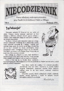 Prezentując zbiory Dokumentów Życia Społecznego na stronach Biblioteki Elbląskiej, szczególnie jej zajmującą podkategorię materiałów - "gazetki szkolne", natrafiamy na problem z właściwą klasyfikacją tych materiałów. Przez "gazetki szkolne" rozumie się pewien efekt, działalności uczniów młodszych, młodzieży w czasie ich drogi edukacyjnej. Ze swojej strony, dodaliśmy do tej kategorii - "gazetki młodych ludzi", w czasie odkrywania samego siebie, realizujących się poprzez grupy religijne lub tych starszych będących już studentami. Dlatego umieściliśmy pisma młodzieży katolickiej w tej grupie materiałów źródłowych. Jedno z nich reprezentuje gazetka - "Niecodziennik" - pismo parafii M.B. Królowej Polski znajdującej się przy ulicy Robotniczej 69, posiadamy w swoich zbiorach dwa egzemplarze tego pisemka, z roku 1994 i 1995. Czasopismo było niewielkie, formatu A-5, różnej objętości od 24 do 8 ponumerowanych stron. Gazetka drukowana w tonacji czarno-białej, tekst i grafika, stopka redakcyjna zawierała skład redakcji, określała skład graficzny pisma oraz osobę odpowiedzialną za kontakt. Treściowo skupiała się na oficjalnych tekstach ewangelizujących przygotowanych przez księży, wywiadach z młodymi ludźmi, własnymi tekstami młodzieży, wspomnieniami z odbytych spotkań religijnych. Numer z 1994 roku związany z wakacjami - zawierał, też informacje o mających się odbyć imprezach religijnych, nuty i słowa pieśni młodzieżowych oraz humor wakacyjny - "10 przykazań człowieka szczęśliwego". Warto przytoczyć niektóre z nich - 1. Człowiek rodzi się zmęczony i żyje by odpocząć, 2. Kochaj swe łóżko jak siebie samego, 3. Odpoczywaj w dzień, abyś mógł spać w nocy itd..., 10. Praca uszlachetnia - lenistwo uszczęśliwia. Oprócz tego, w swoich zbiorach posiadamy jeszcze jeden przykład pisma parafialnego z parafii katedralnej w Elblągu.