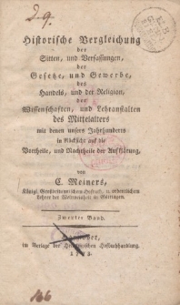 Tytuł: Historische Vergleichung der Sitten, und Verfassungen, der Gesetze, und Gewerbe, des Handles, und der Religion, der Wissenschaften, und Lehranstalten des Mittelalters mit denen unsers Jahrhunderts […] Zweyter Band