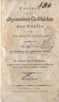 Wydany w 1798 roku w Lipsku tom drugi Versuch einer allgemeinen Geschichte der Poesie von den ältesten Zeiten an […] - dwuczęściowego dzieła z dziedziny historii literatury, którego autorem jest niemiecki pedagog, filolog i poeta Johann David Hartmann (1761-1801). Niniejszy tom jest próbą spojrzenia na historię i kształtowanie się sztuki poetyckiej najstarszych cywilizacji, od początków panowania Aleksandra III Macedońskiego; stgr.Ἀλέξανδρος ὁ Τρίτος ὁ Μακεδών Aleksandros ho Tritos ho Makedon zwanego również Aleksandrem Wielkim; Ἀλέξανδρος ὁ Μέγας Aleksandros ho Megas ( 356 p.n.e. – 323 p.n.e.) - króla Macedonii w latach 336-323 p.n.e. do rozpoczętego w IV wieku n.e. procesu masowego przemieszczania się ludności, określanego w historiografii mianem wielkiej wędrówki ludów. W obszernym dokumencie autor prezentuje historię poezji hebrajskiej, arabskiej, perskiej, hinduskiej, greckiej, rzymskiej, niemieckiej etc. zwracając uwagę m.in. na jej początki, specyfikę, cechy charakterystyczne, oryginalność stylu i języka, genologię, kształtowanie się najwcześniejszych form - gatunków literackich etc. oraz podkreślając znaczenie historii poezji dla szeroko pojętej historii kultury ludzkości.