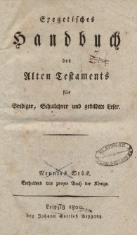 Exegetisches Handbuch des Alten Testaments… (Lipsk, 1800) - część dziewiąta, wydanej anonimowo publikacji z dziedziny biblistyki, a dokładniej egzegezy biblijnej Starego Testamentu. Autorem dokumentu jest niemiecki teolog i filolog Johann Karl Christoph Nachtigal (1753-1819).Twórca w latach 1771-1773 studiował teologię, filologię i historię naturalną na uniwersytecie w Halle. Po ukończeniu studiów powrócił do Szkoły Katedralnej w Halberstadt, gdzie najpierw był nauczycielem, a od 1800 roku jej dyrektorem. W 1800 roku został także mianowany radcą konsystorza. Zajmował się m. in. datowaniem pism w Starym Testamencie. W 1808 roku otrzymał tytuł doktora honoris causa Wydziału Teologicznego Uniwersytetu w Halle. Od 1812 do 1816 roku Nachtigal był generalnym superintendentem księstwa Halberstadt, powiatów Hohenstein i Mansfeld, aż do rozwiązania konsystorza przez nowy podział prowincji w Prusach. Niniejsza, dziewiąta część dokumentu ma na celu zapoznanie czytelnika ze sposobem postępowania przy czytaniu, badaniu i interpretacji treści oraz wydobycie dosłownego znaczenia tekstów, pochodzących z Drugiej Księgi Królewskiej (hebr. מְלָכִים ב Melakhim 2). 1 i 2 Księga Królewska początkowo stanowiły jedną całość. Tekst nie podaje imienia autora; bibliści nie są zgodni, kim mógł być. Przypuszczalnie był prorokiem, ponieważ wiele wydarzeń historycznych zostało ukazanych przez pryzmat wierności (lub niewierności) Izraela i Judy wobec zawartego z Bogiem przymierza. Jako możliwych autorów wymienia się Ezdrasza, Ezechiela lub Jeremiasza. 2 Księga Królewska jest kontynuacją relacji z Pierwszej Księgi Królewskiej i opisuje dalsze, burzliwe dzieje podzielonego królestwa Izraela i Judy. Przedstawia panowanie 29 monarchów - 12 władców północnego królestwa Izraela i 17 panujących w południowym królestwie Judy. 2 Księga Królewska ukazuje wiele niezwykłych wydarzeń i postaci. Dwie osoby zostały wskrzeszone z martwych; prorok Eliasz został za życia zabrany do nieba; dwa razy rozstąpiły się wody rzeki Jordan etc. Wszystkie te cudowne wydarzenia świadczyły o tym, że Bóg jest zaangażowany w życie swojego ludu. Księga ukazuje również działalność pierwszych proroków. Amos i Ozeasz działali w królestwie północnym (Izrael), natomiast Izajasz, Joel, Micheasz, Nahum, Habakuk, Sofoniasz i Jeremiasz przemawiali do mieszkańców Królestwa Judy. Wszyscy bez wyjątku nawoływali do nawrócenia, ostrzegając przed nadchodzącym Bożym sądem. Autor księgi poświęcił także wiele miejsca działalności proroka Elizeusza, następcy Eliasza, skupiając się na licznych dokonanych przez niego cudach. Pomimo działalności proroków, nawołujących do zmiany postępowania i powrotu do Boga, ludzie uparcie trwali w grzechu. Zapowiedzi zniszczenia „wybranego” narodu nikt nie brał na poważnie. Choć Bóg zesłał karę na nieposłuszny naród, nie zapomniał jednak o obietnicy złożonej Dawidowi. Ocalił resztkę swojego ludu i zachował królewską linię od wyginięcia. Była to zapowiedź przyszłej odnowy - powrotu narodu do swojej ziemi i nadejścia Króla-Odkupiciela. Opracowanie, jak wskazuje karta tytułowa, przeznaczone zostało dla kaznodziejów, nauczycieli szkolnych i wykształconych czytelników. W literaturze określane było jako dokument wnoszący cenny wkład egzegetyczny do Starego Testamentu.