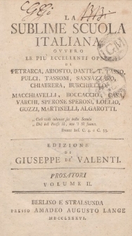 Tytuł: La sublime scuola italiana ovvero le piu eccellenti opere di Petrarca, Ariosto, Dante, T. Tasso, Pulci, Tassoni, Sannazzaro, Chiabrera, Burchiello, Macchiavelli, Boccaccio, Casa, Varchi […] Edizione di Giuseppe de Valenti. Prosatori Volume II