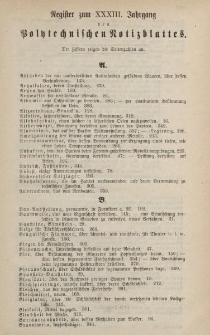 Title: Polytechnisches Notizblatt für Chemiker, Gewerbtreibende, Fabrikanten und Künstler, XXXIII Jahrgang, Register
